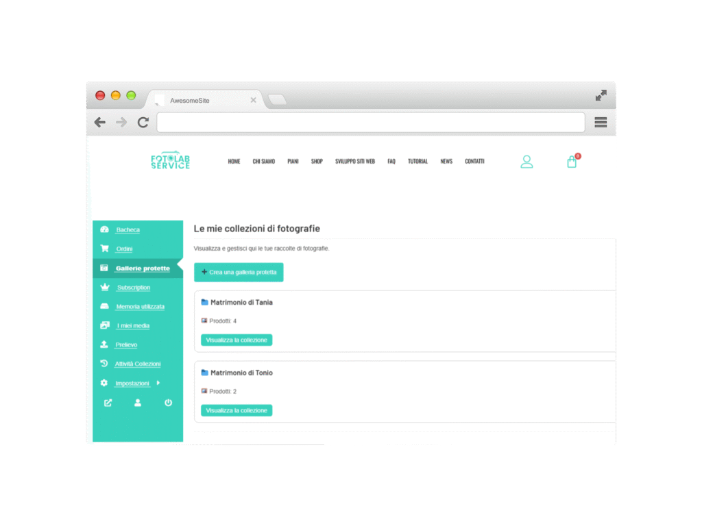 Il fotografo entra nel proprio account e visualizza tutte le gallerie fotografiche giΓ create, con la possibilitΓ di crearne di nuove in modo semplice e rapido.