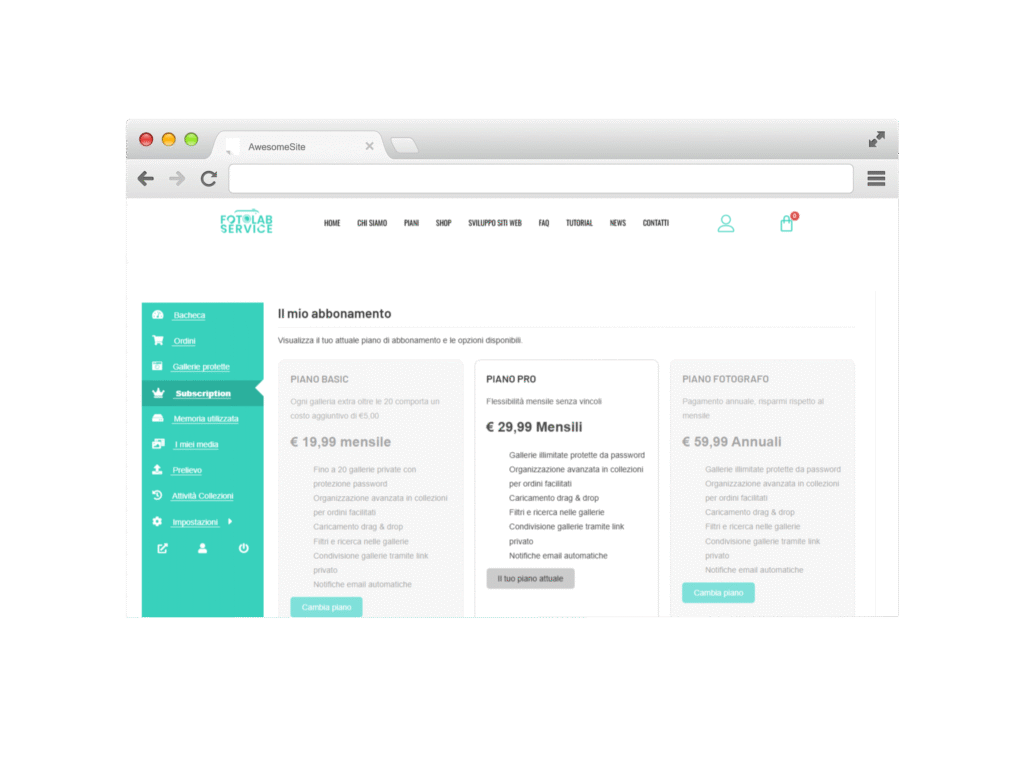 Controllo completo sugli abbonamenti attivi: il fotografo puΓ² verificare lo stato del proprio piano, modificare o cambiare tipologia in base alle esigenze.