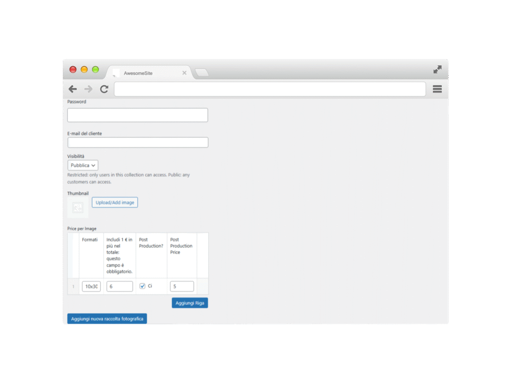 Il fotografo puΓ² aggiungere nuove raccolte inserendo nome, descrizione, password di accesso e mail del cliente, assicurando sicurezza e personalizzazione.