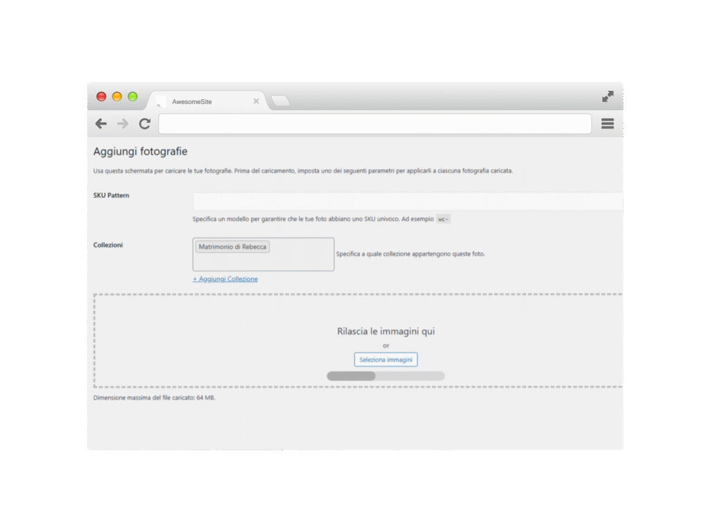 Selezione e caricamento delle foto allβinterno della piattaforma, con la possibilitΓ di rinominare i file per una migliore organizzazione.
